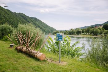 Parkplatz. Der Weg führt entlang der Donau zu Wildpflanzen, einem Klangspiel aus